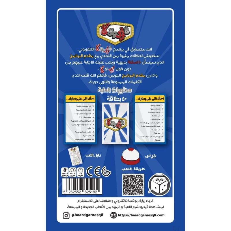 An extended edition of Bedon kalam a set of 200 sticks double sided categorized into music and movies in both languages Arabic and English. You pick a card and you act it within a minute and if you need to add up an extra fun and challenging factor you can roll the challenge dice and if you needed a helping hand you roll the helping dice!